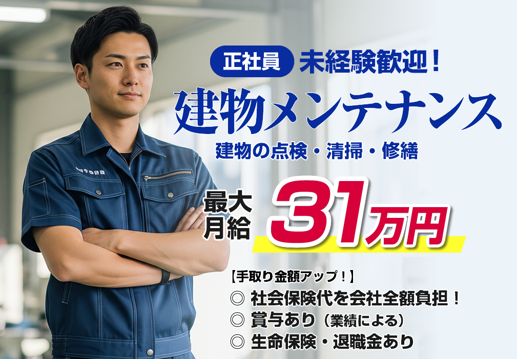 | 仕事内容 | 建物内メンテナンス(床の洗浄・ワックス、エアコン分解洗浄 など) 建物外メンテナンス(ガラス、外壁タイル、塗装面などの高所メンテナンス など) ※最初は先輩スタッフの補助作業からスタートします |